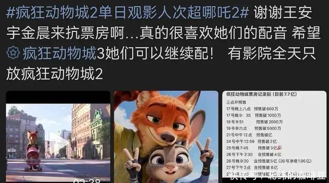 硬蹭还给自己贴金?金晨王安宇居然买《疯狂动物》扛票房的营销? 不知道国内谁做的引进和宣发,愚蠢得要命。 这种家喻户晓的IP到底有什么必要再请明星配音,IP的影响力和吸引力已经比请的那几位大了。 如果直接全专业配音演员阵容,然后反过来宣传“中配全专业团队,无任何明星演员”甚至反而更拉好感。